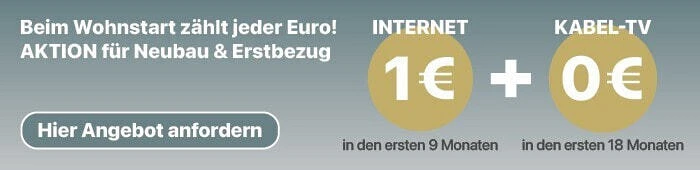 Aktionsangebot Neubau & Erstbezug: Internet € 1 pro Monat in den ersten 9 Monaten und Kabel-TV € 0 pro Monat in den ersten 18 Monaten bei Bestellung von Kombi Internet und Kabel-TV. Diese Aktion ist nur gültig bei Erstbezug von Einfamilienhaus- und Mehrfamilienhaus-Neubauten. |
